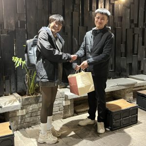Mình chụp cảnh 2 đứa bắt tay, vì bức ảnh đầu tiên của 2 đứa trông cũng như thế. Hôm đó mình chạy sự kiện rồi gặp anh A luôn nên không kịp ăn trưa. Anh sợ mình đói, lại nhớ mình từng bảo thích ăn bánh sừng bò, nên anh mua cho mình nguyên một set bánh.